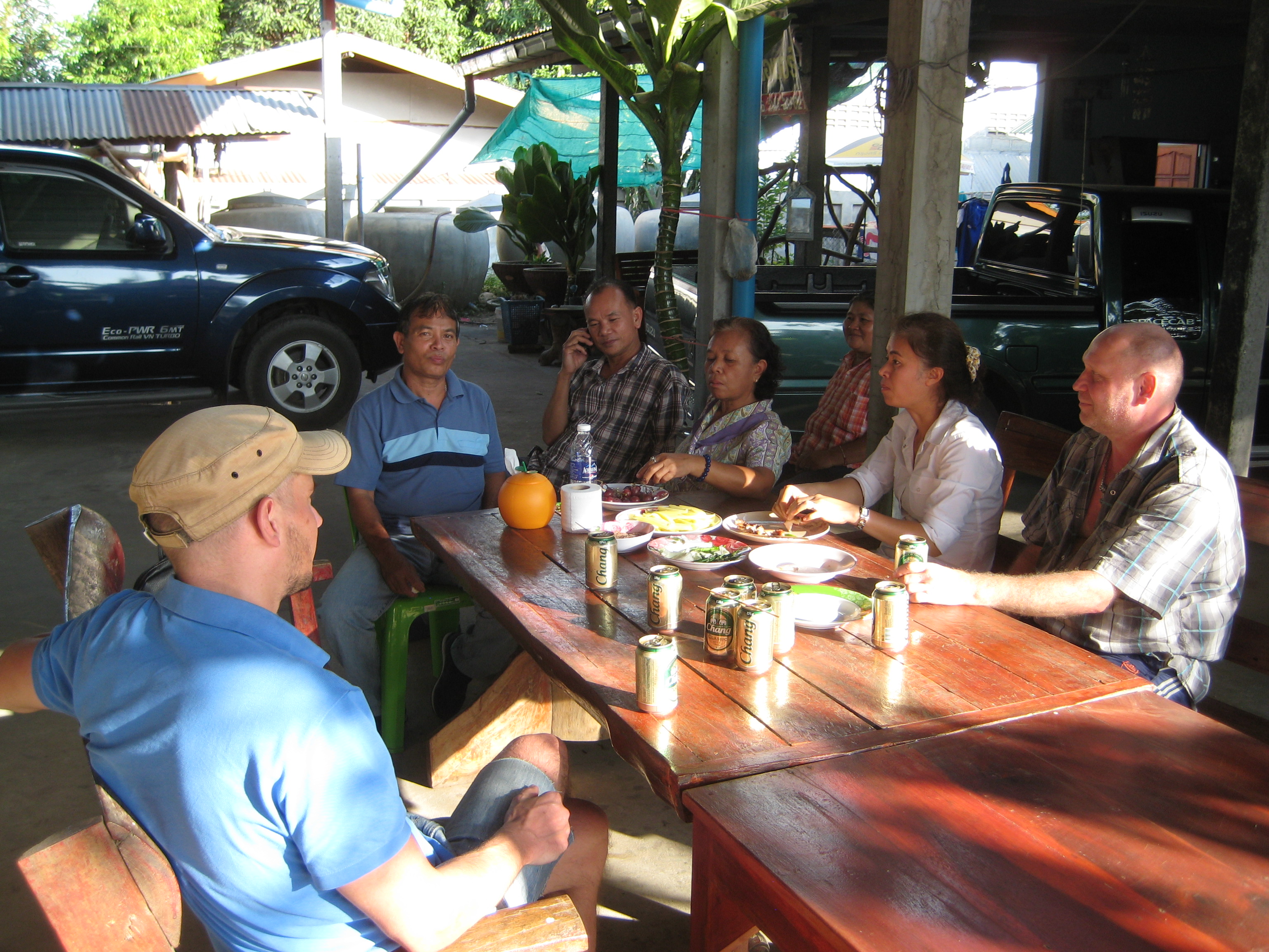 Nach einem anschließenden vergeblichen Versuch, ein Bier zur Erfrischung aufzutreiben (es war Mittagspause – von 14:00 bis 17:00 wird kein Alkohol verkauft…) fuhren wir zu einem Bruder von Pha, der eine Autowerkstatt etwa 30 Autominuten entfernt hat. Dieser hatte auch einen Laden und dort konnten wir ein kühles Nass zur inneren Erfrischung ergattern. Wir mussten es allerdings unauffällig hinter dem Haus trinken, da die Sperrzeit noch nicht ganz vorbei war.